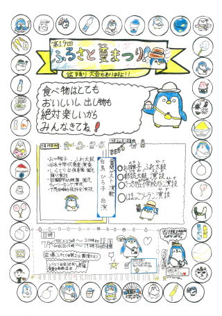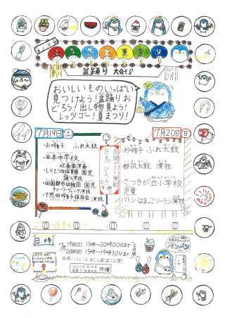 今年の夏祭りのポスターをさつきが丘小学校5年生3クラスが、クラスごとに作成しました。(3種類のポスターは、自治会の掲示板、商店会加盟店舗に掲示しております。)