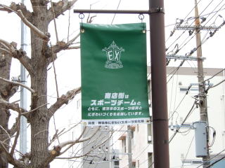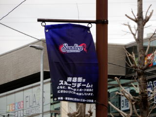 街路灯に6チームのフラッグを設置